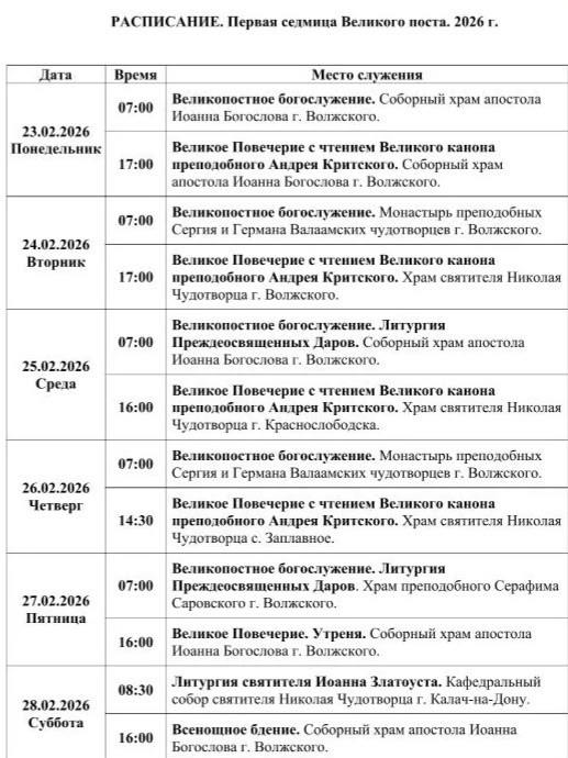 23 февраля 2026 г., утром в понедельник первой седмицы Великого поста, епископ Калачевский и Палласовский ИОАНН совершил уставные великопостные богослужения: утреню, чин изобразительны, часы и вечерню, не переходящую в Литургию Преждеосвященных Даров. Служба прошла в Соборном храме Апостола и евангелиста Иоанна Богослова (г. Волжский). Его Преосвященству сослужили клирики Соборного храма: …