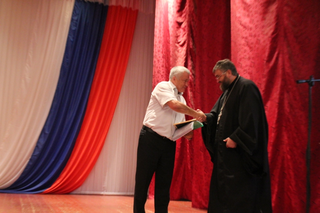 Отец Петр поздравил педагогов района с началом нового учебного года и пожелал помощи Божией в нелегком, но благородном труде по воспитанию и обучению подрастающего поколения и вручил благодарственное письмо за подписью епископа Калачевского и Палласовского Иоанна председателю комитета по образованию Б.Н. Чеботареву за вклад в духовно-нравственное просвещение и воспитание подрастающего поколения.