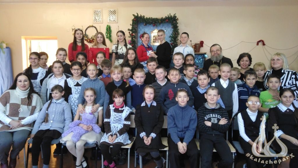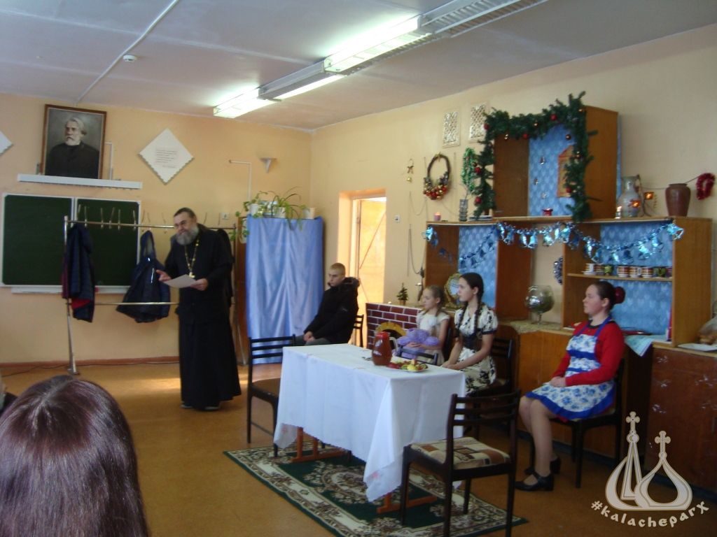 В гости к ребятам приехал настоятель храма св. ап. Петра и Павла с. Лог иерей Александр Лобан. Перед спектаклем батюшка рассказал о Рождении Иисуса Христа, о Его великой жертве во имя спасения людей, призвал детей помогать людям в трудную минуту, быть добрее друг к другу.