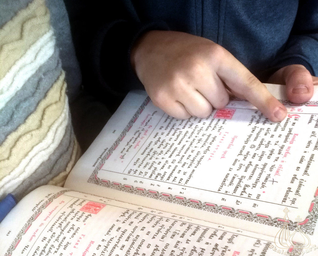 Дети с большим интересом познакомились с Богослужебными книгами и даже пробовали читать Апостол на церковнославянском языке.