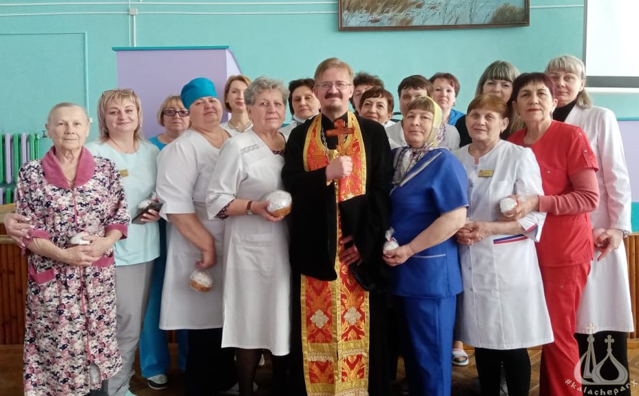 Священник отслужил Пасхальный молебен, поздравил медицинский персонал с Великим праздником, пожелал работникам доброй попечительности и терпения в нелегком деле помощи больным людям, быть снисходительными к их немощам. Затем батюшка вручил пасхальные подарки.
