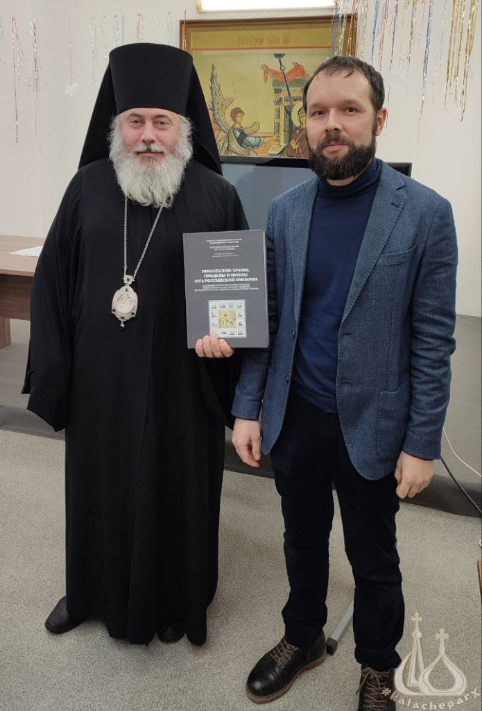 В завершение встречи краевед и меценат Игорь Будков представил свежее издание о Никольских храмах юга Российской империи. Владыка Иоанн поблагодарил исследователя за труд.
