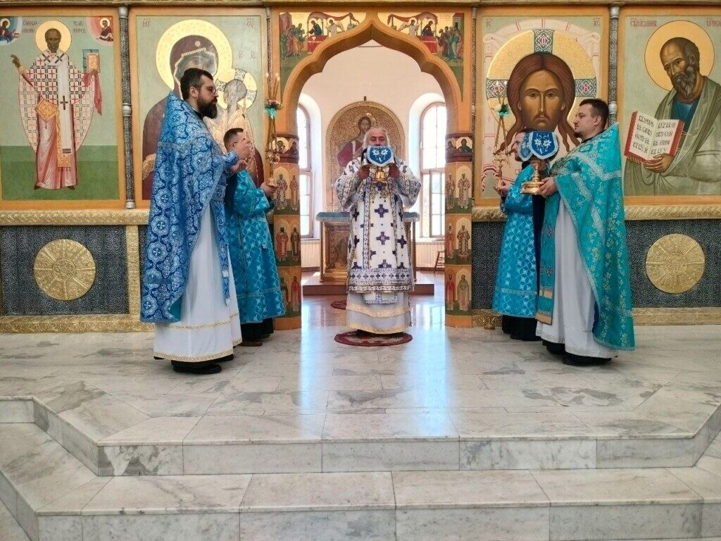 За Божественной литургией Его Преосвященству сослужили клирики Собора: иерей Илия Юханаев, иерей Александр Протопопов, диакон Владимир Кощеев.