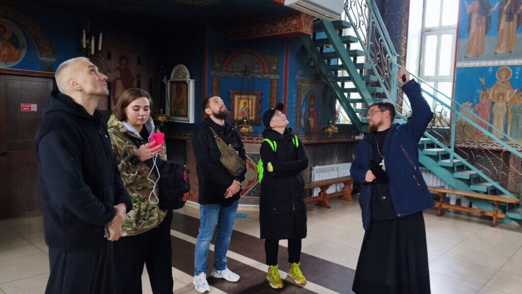 Конечной точкой маршрута стал Соборный храм апостола Иоанна Богослова, экскурсию по которому проводил руководитель Епархиального отдела по делам молодежи, иерей Илья Юханаев. Отец Илья рассказал об истории строительства храма, показал где располагалась часовня, вход в нижний храм, через который молящиеся заходили, когда шло строительство верхнего храма, верхний и нижний храмы. Закончилось путешествие трапезой, во время которой обсуждали планы на дальнейшее сотрудничество.
