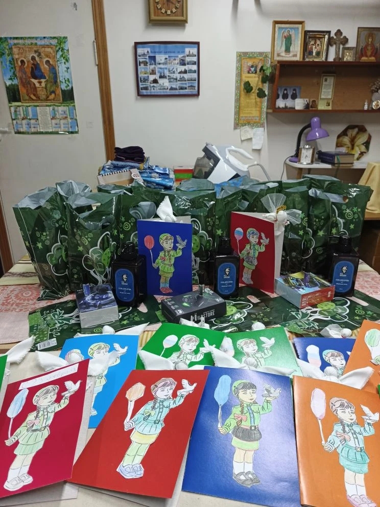Каждому раненому бойцу были переданы подарочные наборы (беспроводные наушники, гель для душа, туалетная вода), а также поздравительные открытки, сделанные воспитанниками приходской воскресной школы.