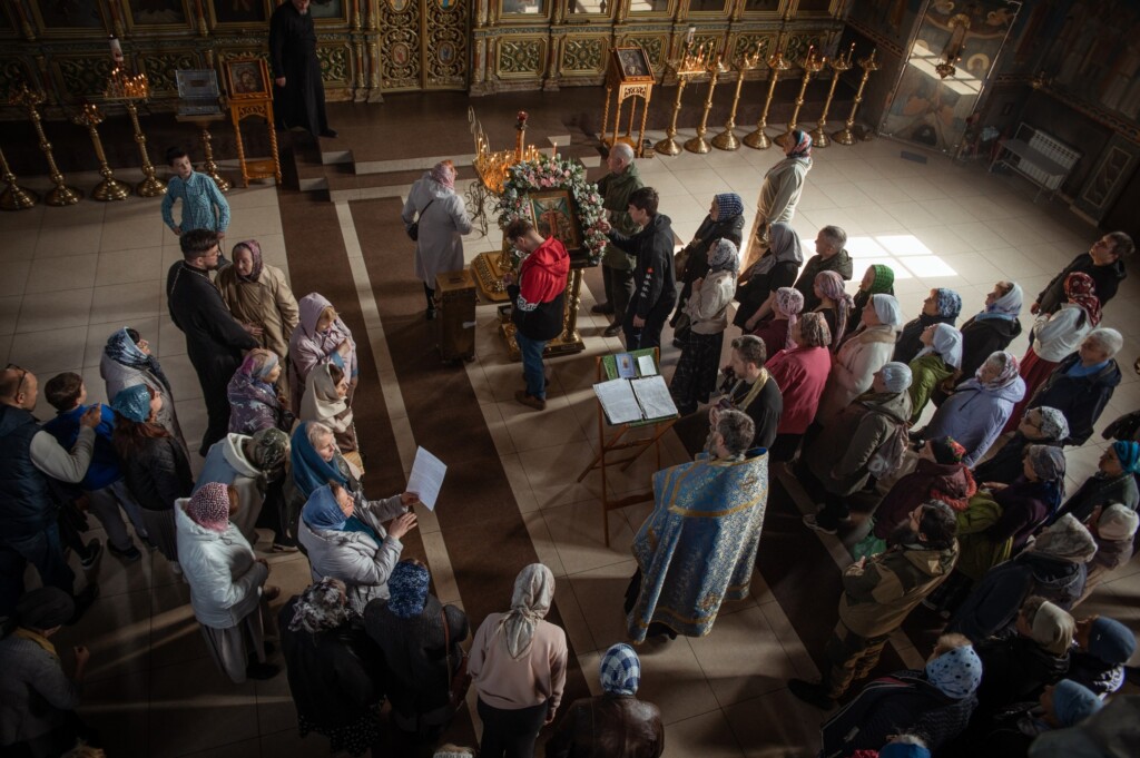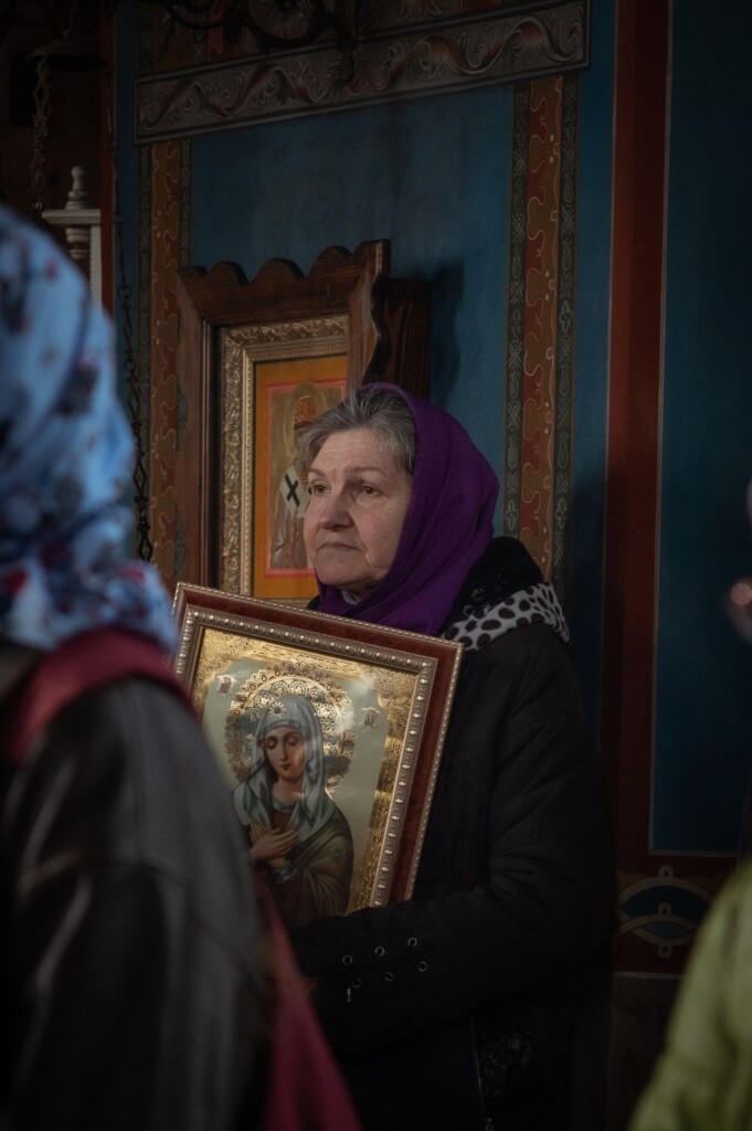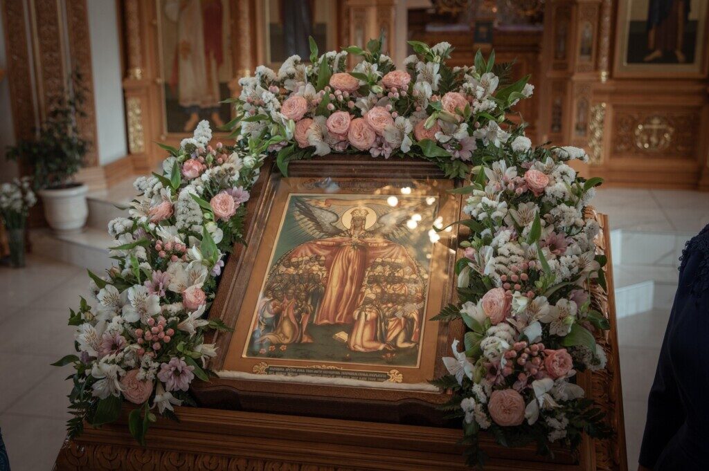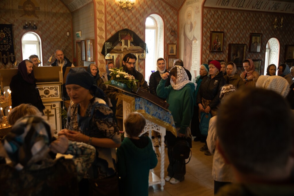 28 марта 2026 г., в праздник Похвалы Пресвятой Богородицы, волжане молились перед мироточивой иконой «Покрый нас Кровом Крылу Твоею», которая была принесена из Волгограда.