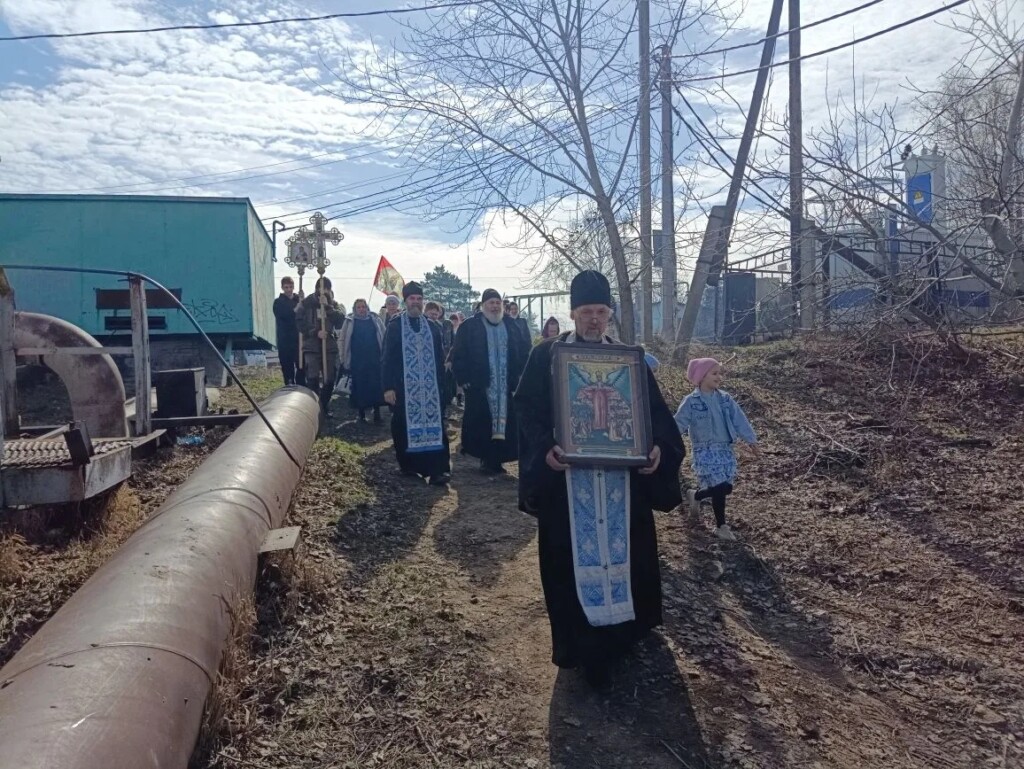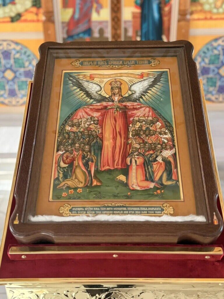 На центральном аналое располагалась икона Божией Матери «Покрый нас Кровом Крылу Твоею», с которой епископ Иоанн осуществил крестный ход по реке Ахтубе. Мироточивый образ был доставлен в Калачёвскую епархию из города Волгограда.